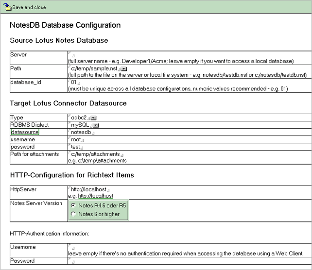 Mit dem Button 'Save and close' können Sie die Datenbankkonfiguration speichern und